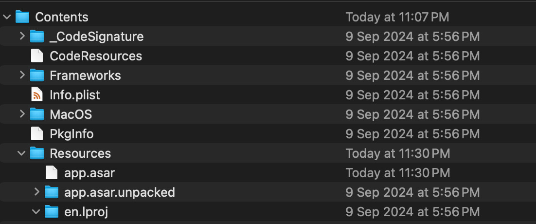 Now go to the original .app of your application, right click > show package contents > delete the original app.asar from the Resources folder and copy the modified newly packaged app.asar into it.